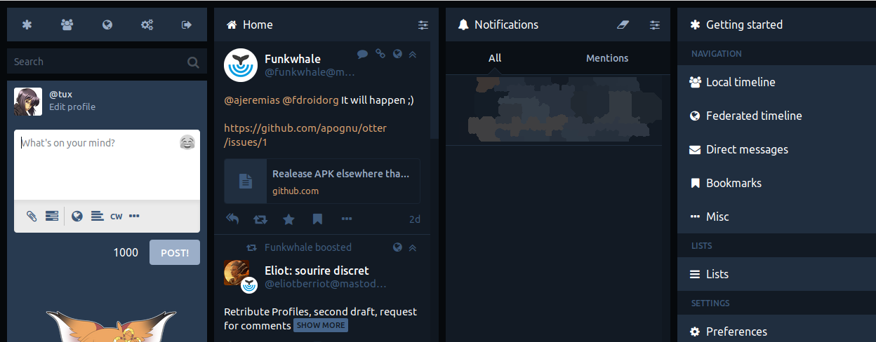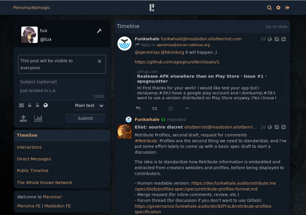 The Web interface is the recommended way to use to connect to Pleroma from a computer ( https://social.nomagic.uk ). You will need some time to get used to the interface, and it is highly recommend that you read the Pleroma presentation from the project official website.